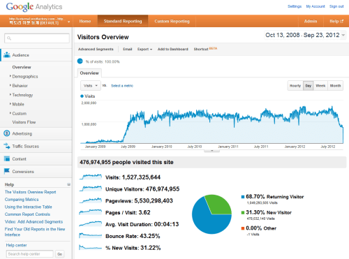위자드팩토리는 구글 통계 기준으로 지금까지 1442일 동안 4억 7,697만 명의 순방문자(UV)에게 위젯 서비스를 제공했습니다. 60억 인구의 7.9%가 위자드팩토리 위젯을 한 번이라도 보았습니다. 지금까지 총 55억 3,029만 회의 위젯이 서비스되었습니다.