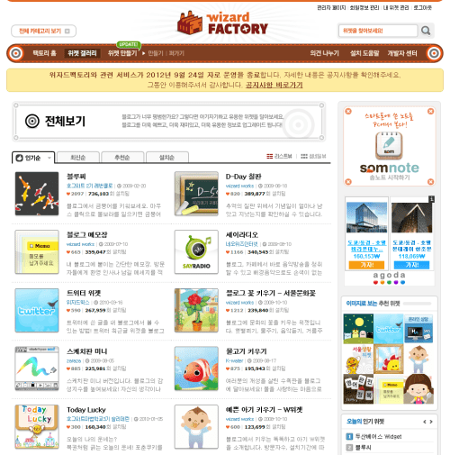 2012년 9월 24일. 만 3년 11개월 11일을 운영해온 1등 위젯 플랫폼 위자드팩토리의 서비스를 오늘 종료했습니다. 저희로서는 솜클라우드에 모든 역량을 집중하기 위한 조치였고 오늘 자정을 기해 위젯을 모두 일몰했습니다.