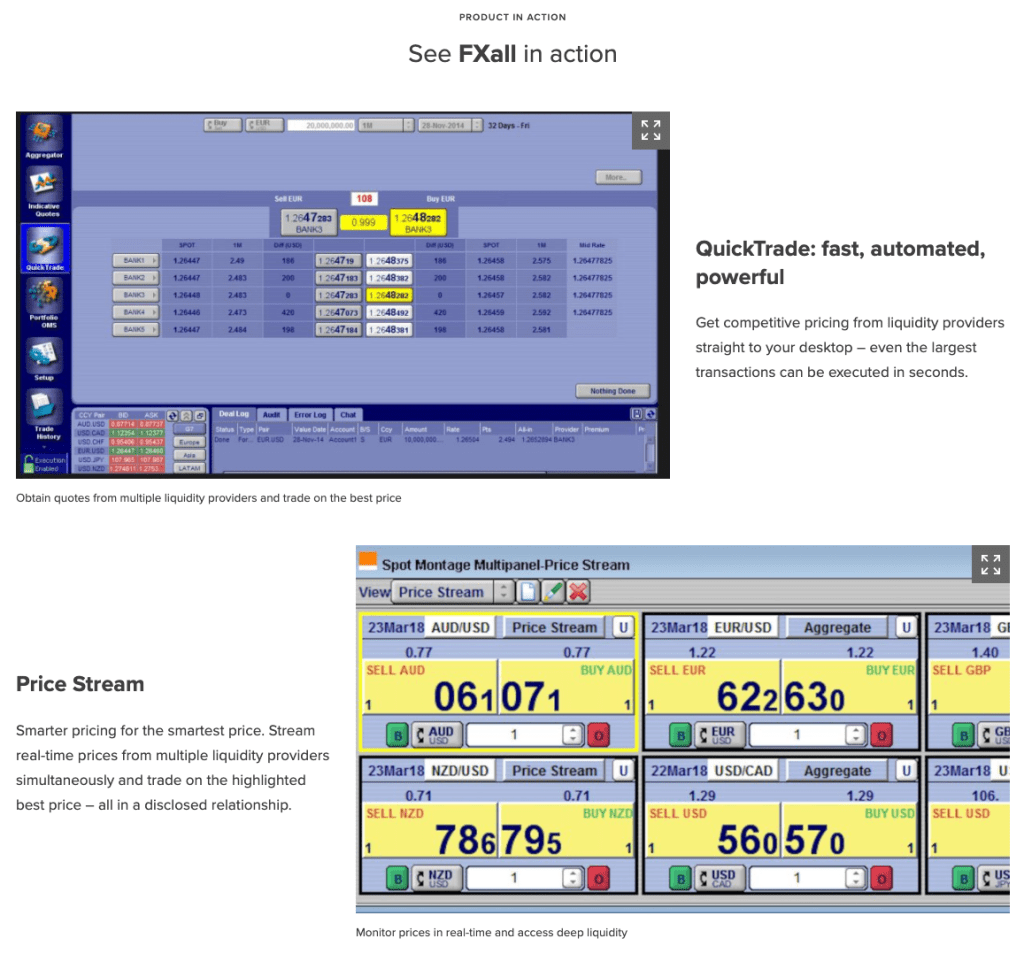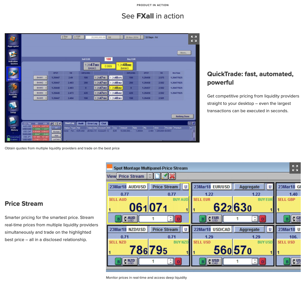 FXall은 그 문제에 주목해 이미 전자화 된 전세계 은행들의 환율을 API로 모으기 시작했습니다. 그래서 고객이 FXall을 설치하고 이제 이 소프트웨어 한 곳에만 물어보면 FXall은 연결된 전세계 거의모든 은행에 동시에 질의해 가장 좋은 가격을 찾아 고객에게 연결합니다. 당연히 기존에 친한 두세개 은행에 물어보던 때와는 비교도 안될 정도로 좋은 가격을 고객은 찾을 수 있게 되었습니다.