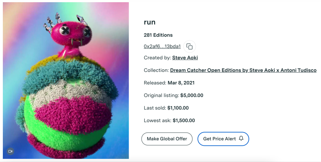 이 유행의 끝엔 대부분의 NFT는 물릴 것 같다. 나도 물렸다. 올해 초였나 트위터 800만 팔로워를 가진 세계적인 DJ Steve Aoki가 당시만 해도 유명인 중에서는 아주 선도적으로 발행하는 NFT를 $4,500 주고 샀다. 이 글을 쓰기 위해 이 NFT를 구매했던 NiftyGateway에 오랜만에 들어가보니 누가 나에게 고작 $100에 팔라고 오퍼를 보내놓았다. 거래소 수수료를 떼면 $84.70을 받는단다. ㅎㅎ