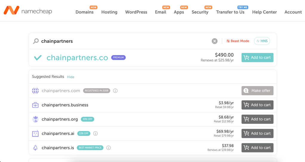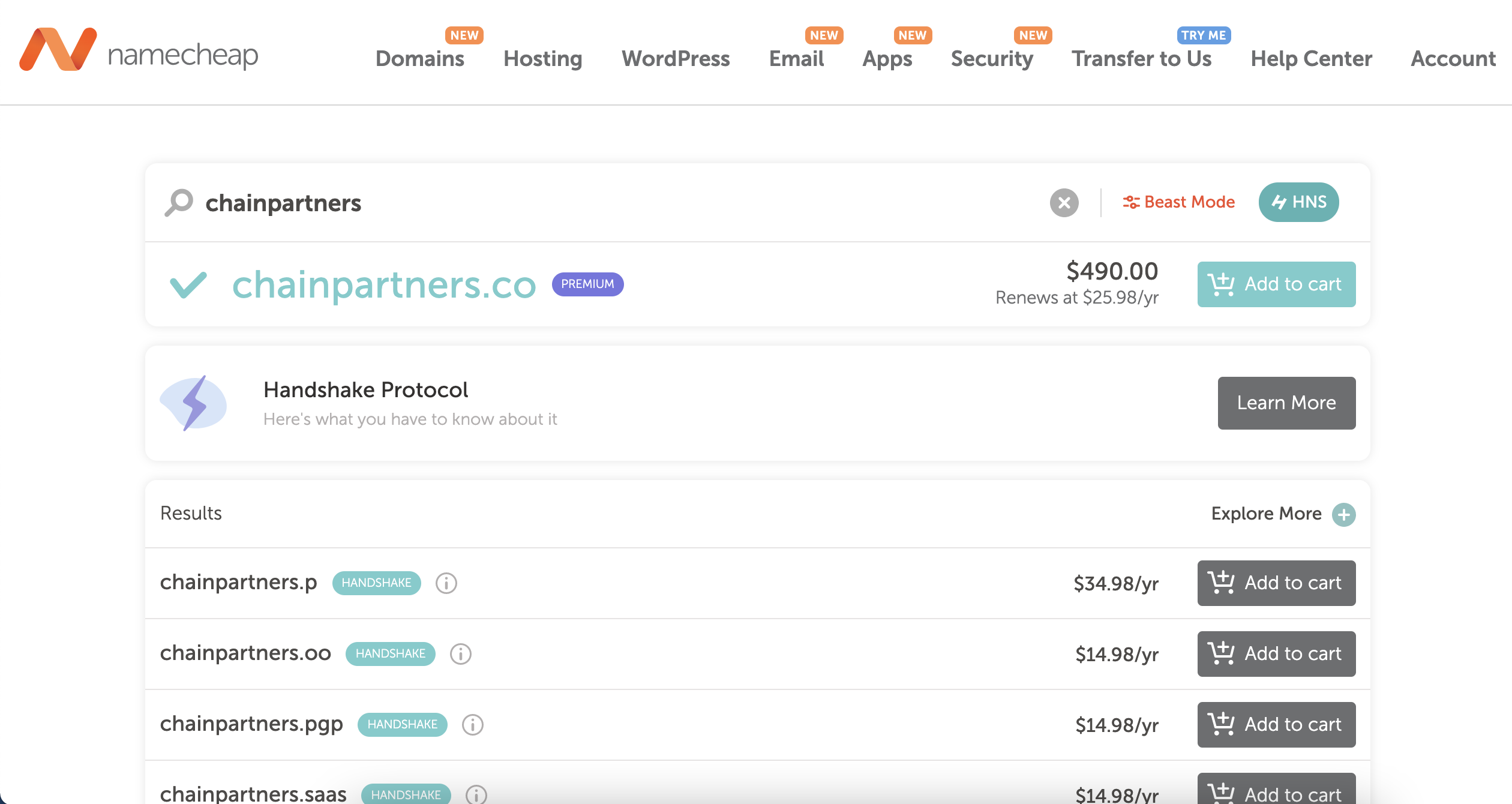 그러면 ICANN 체제를 거스르는 인터넷 접속을 가능하게 도와준 ISP에게 Handshake 재단이 HNS 토큰을 선물로 지급하겠다는 아이디어다. 실제로 HNS의 토크노믹스를 보면 상당량이 이런 파트너사들에 대한 선물로 배정되어 있는데, 미국 내 최대 도메인 사업자 중 하나인 Namecheap이 올들어 HNS 도메인을 적용하고 기존 서비스 UI 내에 자연스러운 통합을 시도하고 있다. 아마도 HNS 토큰을 받았을 것으로 추정된다.