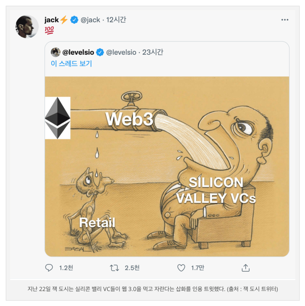 따라서 웹3는 이미 수년 전부터 이더리움을 필두로 한 블록체인 진형이 꿈꾸던 미래였는데, 이제 그것이 크립토 Hype cycle과 맞물려 실리콘밸리 전통 VC들과 Early Adoptor들의 본격적인 관심을 끄는 것 같다. 그게 하도 지나쳐 식사 자리며 커피 자리며 할 것 없이 지금 실리콘밸리에서는 너도 나도 ‘웹3, 웹3’하니까 이제 2021년판 에릭 슈미트에 해당하는 일론 머스크와 잭 도시가 마치 그때의 에릭 슈미트처럼 ‘그만 좀 하라’며 일침을 가하고 있는 것이다.