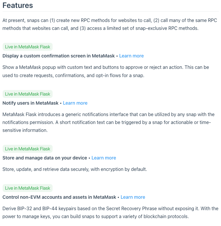 크롬 익스텐션이 생기는게 뭐 그리 대단한 일이냐고 할 수 있겠으나 그래도 Web3 세상의 가장 큰 브라우저(Web3에서는 지갑이 곧 브라우저다)가 열리는 기회이니 만큼 개발자들이 주목할 필요가 있다. 이미 해외에서는 굉장히 많은 팀들이 Snap을 준비하고 있는데 한국에서는 너무 조용한거 같아 자세히 언급해 본다.