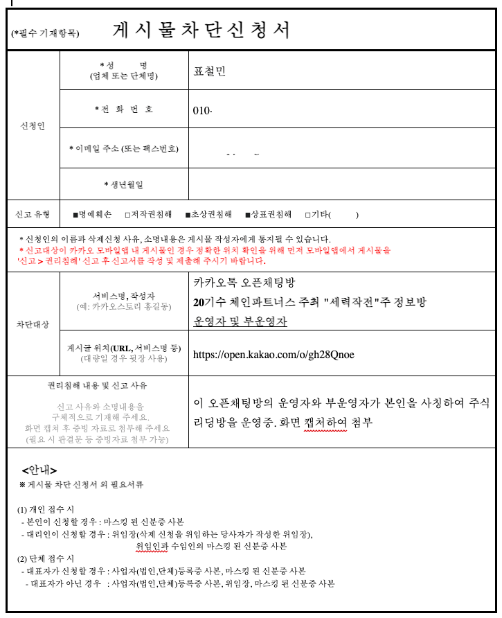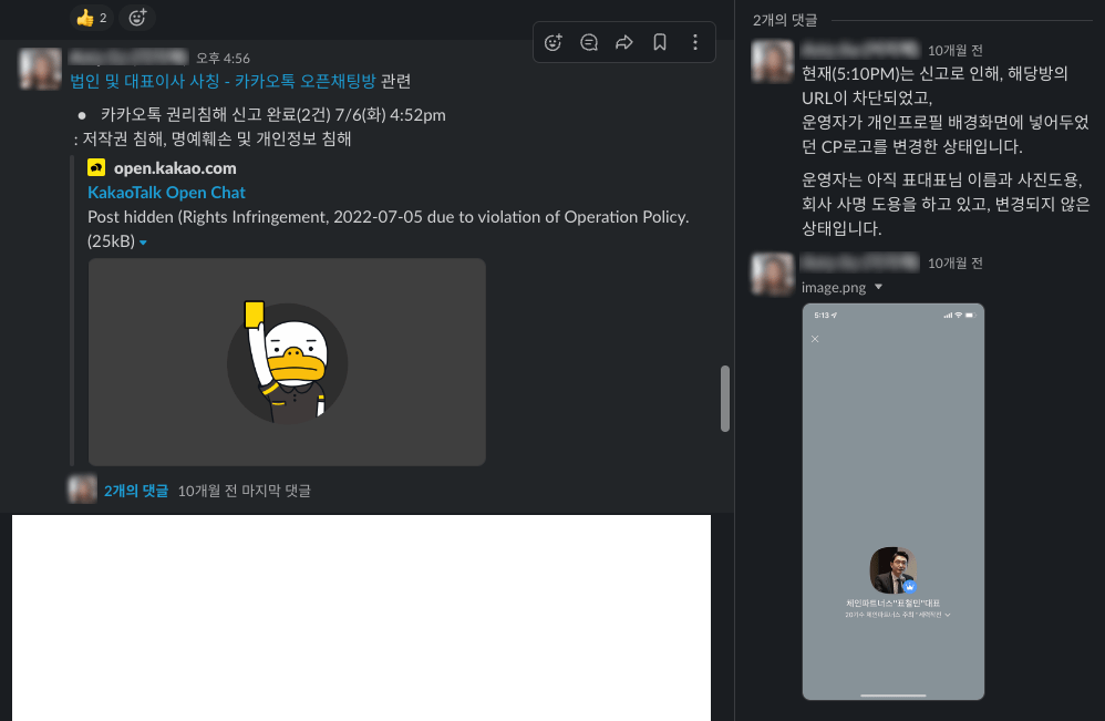 우리 회사에서는 계속 아래와 같이 카카오측에 삭제 및 신고 요청을 하고 있다.