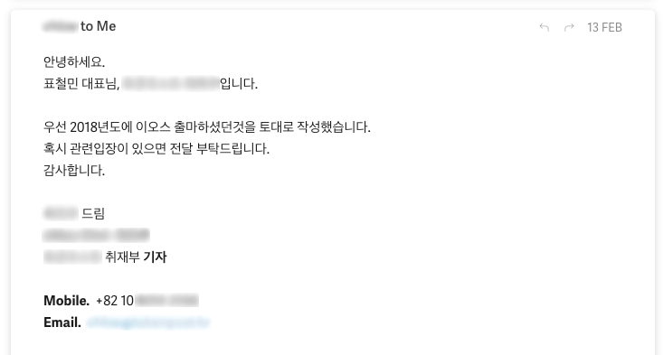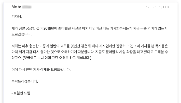 그리고는 열흘이 지난 2월 23일 해당 기사를 쓴 기자로부터 아래와 같은 메일을 받았다.