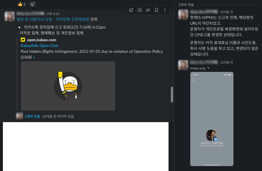우리 회사에서는 계속 아래와 같이 카카오측에 삭제 및 신고 요청을 하고 있다.