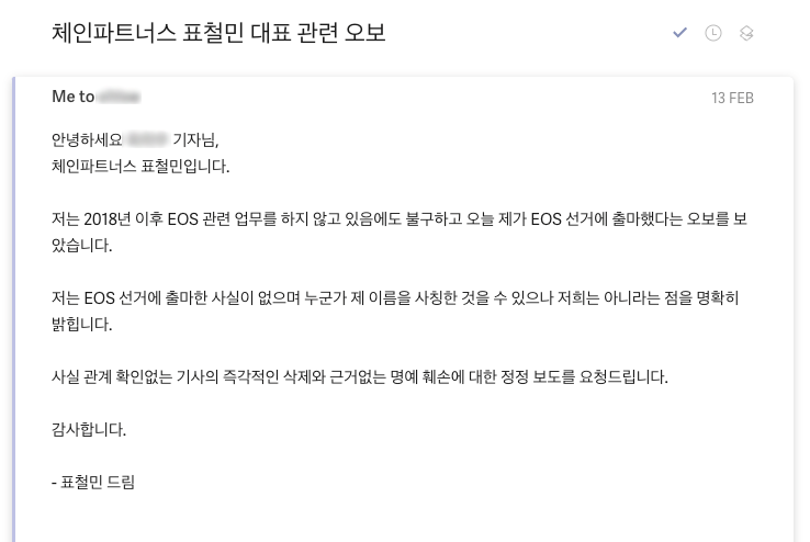 그동안 악의적 보도는 종종 겪어왔지만 이런 터무니없는 ‘소설 기사’는 겪어본 적이 없었다. 그런데 벌써 기사 댓글에는 그걸 믿고 나를 비난하는 여러 댓글이 달리고 있었다. 가십을 좋아하는 텔레그램 커뮤니티 등에도 ‘아니 표철민이 EOS 선거에 또 나간다고? 이런 정신나간 X’ 하면서 신나게 공유가 되고 있었다.