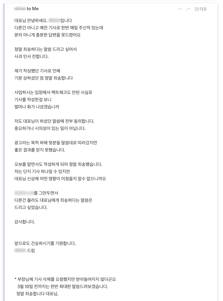 그러니까 위에서 시켜서 광고를 얻어내기 위해 억지로 짜깁기 해 쓴 기사였다는 것이다. 퇴사하는 마당에라도 이런 사과를 남겨준 기자에게는 개인적으로 고마웠으나 삭제 요청이 받아들여지지 않았고 3월 10일 전까지 최대한 말씀드려본다는 노력 역시 받아들여지지 않은 것으로 보인다. (해당 기사는 지금까지도 남아있다.)