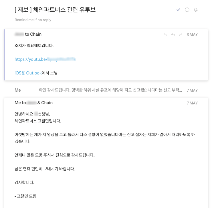 선량한 피해자들이 더이상 나오지 않게 하기 위해서라도 앞으로 가짜 뉴스와 어그로를 끌기 위한 익명 유튜브를 운영하는 사람들은 앞으로 정말로 나에게 제보가 안들어오기를 바래야만 할 것이다.