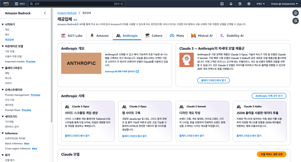 지금 AWS에 가보면 자체 Bedrock 모델도 있고, 자기가 거액을 투자해 GPT 대항마로 계속 키우고 있는 Anthropic 모델도 있고 또 Mistral이나 특정 버티컬 전용 모델(금융 특화 LLM 등) 등 수십가지 모델을 API 호출로 쉽게 쓸 수 있게 하고 있다.