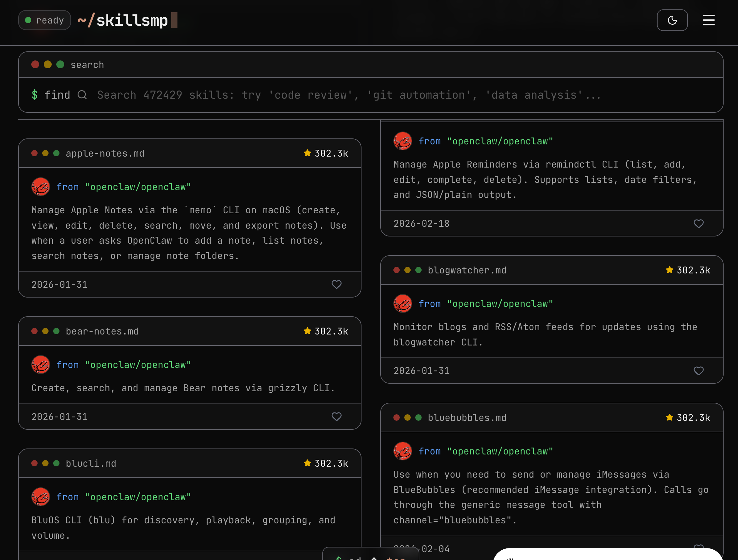 이 거대한 흐름을 보자. 소름이 돋는다. 오픈클로에서 가장 인기있는 앱들은 다 CLI다. 이제 유저를 상대하는 프론트는 그냥 에이전트 하나만 남고, 나머지 모든 서비스는 에이전트가 사용할 수 있는 CLI만 남는다고 상상해도 될 것 같다. UI는 사람이 인터넷을 직접 다뤄야 했던 과거 20년의 산물이 될 것이다.